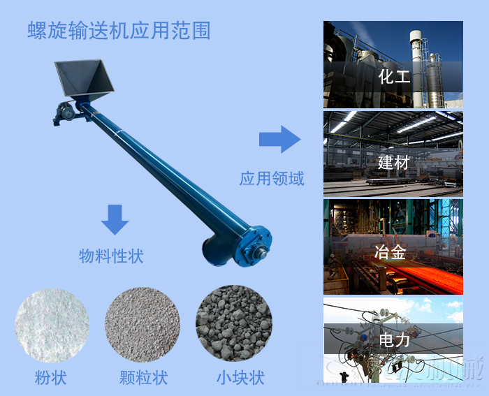 (1)螺旋輸送機是一種廣泛用于化工,建材,糧食等部門的輸送設(shè)備。 它主要用于運輸粉狀,顆粒狀和小塊狀物料。 它不適用于輸送易于變質(zhì),黏稠和團聚的材料。