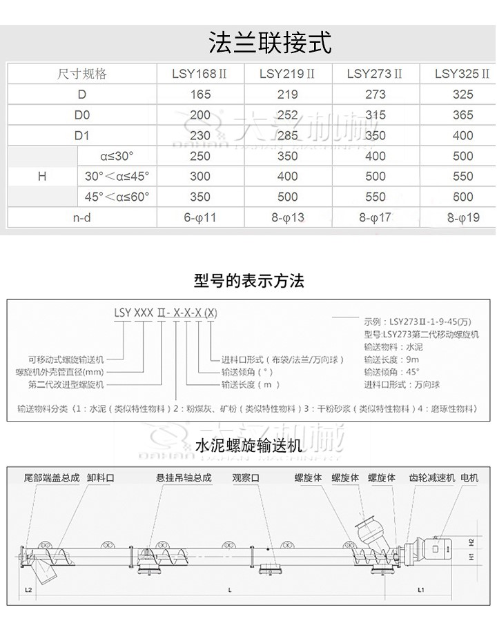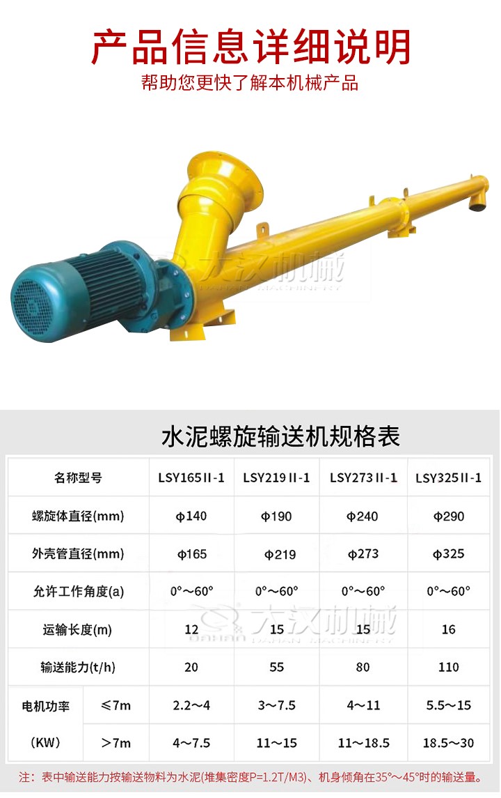 管式螺旋輸送機適用于水平或傾斜輸送粉狀、粒狀和小塊狀物料,如煤、灰、渣、水泥、糧食等,物料溫度小于200℃,不適宜輸送易變質的、黏性大的、易結塊的物料。參數如下:
