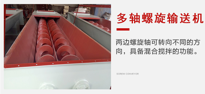 而多軸螺旋輸送機則是兩邊螺旋軸轉向不同的方向,具體混合攪拌的功能。