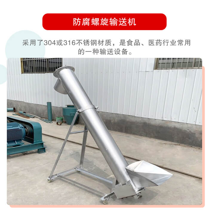 防腐螺旋輸送機采用了304或316不銹鋼材質,是食品、醫藥行業常用的一種輸送設備,今天小編就來為大家介紹一下防腐螺旋輸送機的特點及適用范圍: