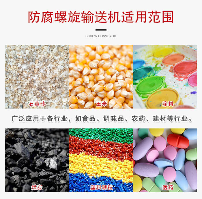防腐螺旋輸送機廣泛應用于各行業,如食品、調味品、農藥、獸藥、建材、化工、電力、冶金、煤礦炭、糧食等行業,適用于水平或傾斜輸送粉狀、粒狀和小塊狀物料,尤其適合食品、醫藥行業,滿足行業衛生標準,可輸送諸如面粉、飼料、花椒粉、藥粉等物料。