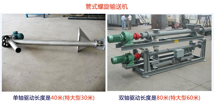 管式螺旋輸送機單軸驅動長度是40m(特大型30m),雙軸驅動長度是80m(特大型60m),長度劃分是每一檔0.5m,可根據自身需求選擇。