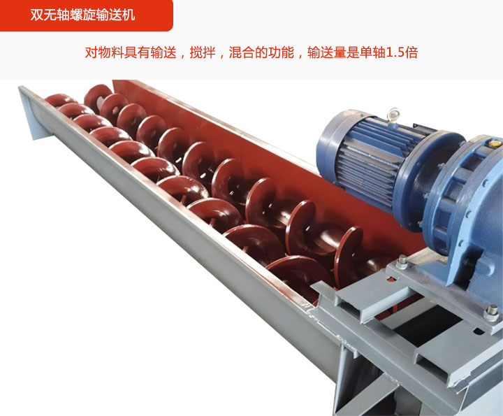 雙無軸螺旋輸送機:采用兩根螺旋軸組成,且軸旋轉方向相反,輸送物料同時還可對物料攪拌,混合,其輸送量是單軸1.5倍