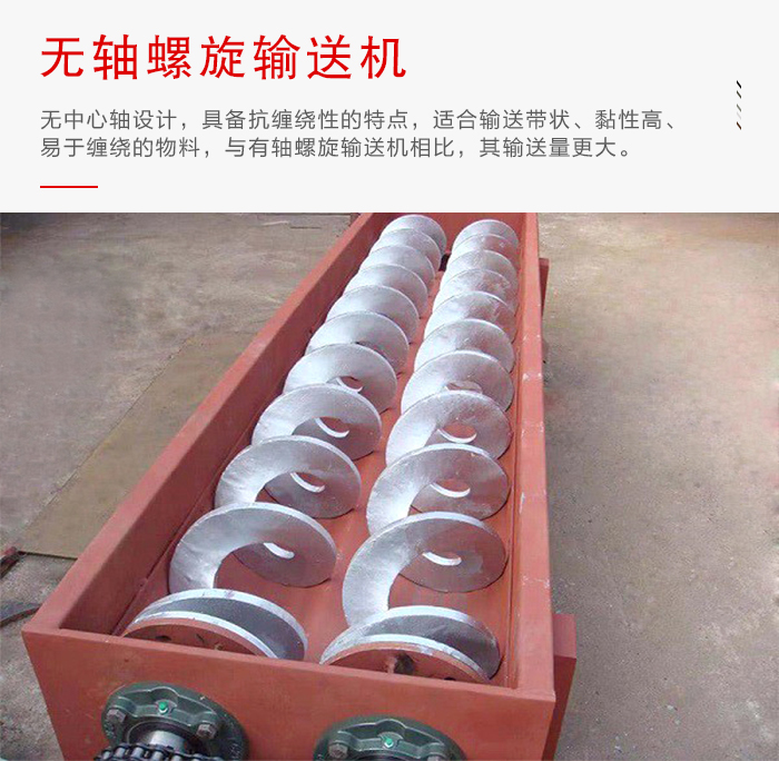 無軸螺旋輸送機采用了無中心軸設計,具備防纏繞性,可以用于輸送粘性強、纏繞性物料,如水泥、污泥、廚余垃圾等物料,可水平、傾斜輸送(傾斜角度不超過20°),大漢無軸螺旋輸送機可分為單無軸和雙無軸螺旋輸送機,還可根據輸送物料及應用場合分為碳鋼、不銹鋼材質。