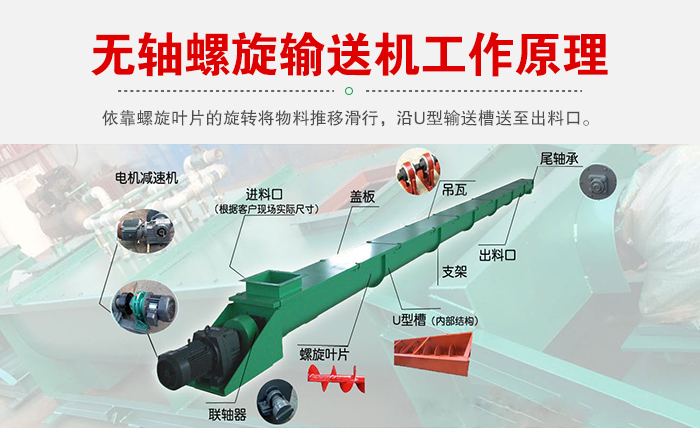 無軸螺旋輸送機由驅動機構(電機減速機、傳動軸)、U型槽與支架、無軸螺旋、襯條、蓋板、進料口、出料口、緊固件等部件組成。當物料從輸送機的進料口進入,依靠螺旋葉片的旋轉將物料推移滑行,沿U型輸送槽送至出料口,并與壓榨機或垃圾小車配套,將物料進行下一步處理。