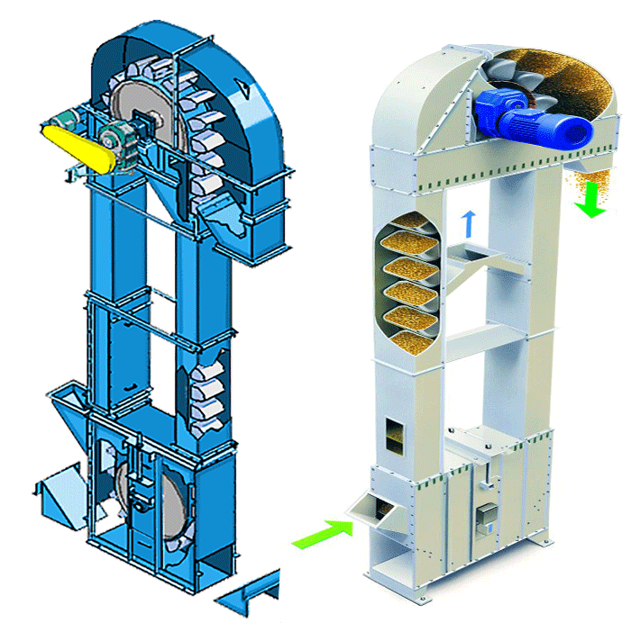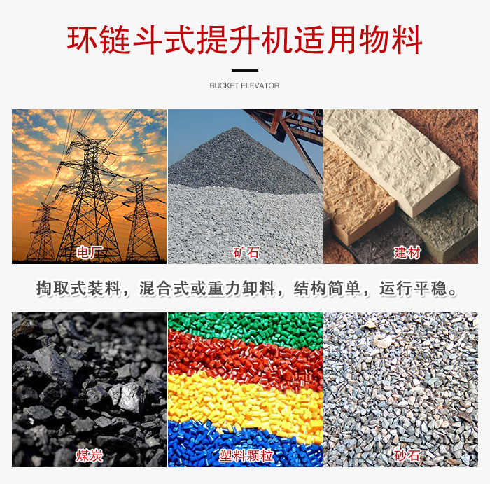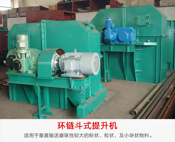環(huán)鏈斗式提升機適用于垂直輸送磨琢性較大的粉狀、粒狀、及小塊狀物料,如糧食、煤、水泥、碎礦石等,輸送高度不超過40m,其特點為,結構簡單,運行平穩(wěn),掏取式裝料,混合式或重力卸料,輪緣采用組合鏈輪,更換方便,鏈輪輪緣經特殊處理壽命長,下部如采用重力自動張緊裝置,能保持恒定的張力,避免打滑或脫鏈,同時在料斗遇阻時,有一定的容讓性能夠有效地保護運動部件,物料溫度不超過250℃。